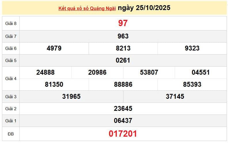 XSQNG 25/10, KQXSQNG 25/10. Xem lại kết quả xổ số Quảng Ngãi ngày 25/10/2025