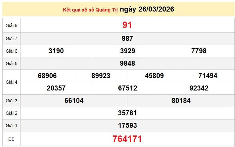 XSQT 26/3, KQXSQT 26/3. Xem lại kết quả xổ số Quảng Trị ngày 26/3/2026