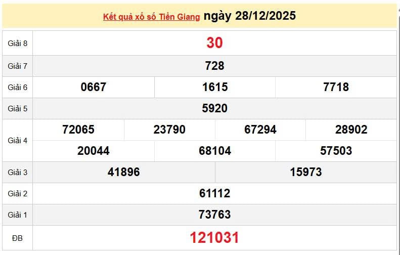 XSTG 28/12, KQXSTG 28/12. Xem lại kết quả xổ số Tiền Giang ngày 28/12/2025