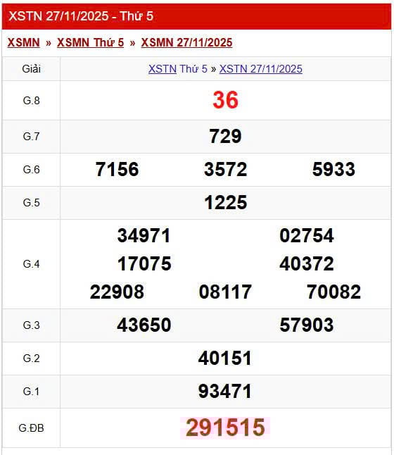 XSTN 27/11, KQXSTN 27/11, kết quả xổ số Tây Ninh ngày 27/11/2025