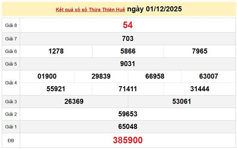 XSTTH 1/12, KQXSTTH 1/12. Xem lại kết quả xổ số Thừa Thiên Huế ngày 1/12/2025