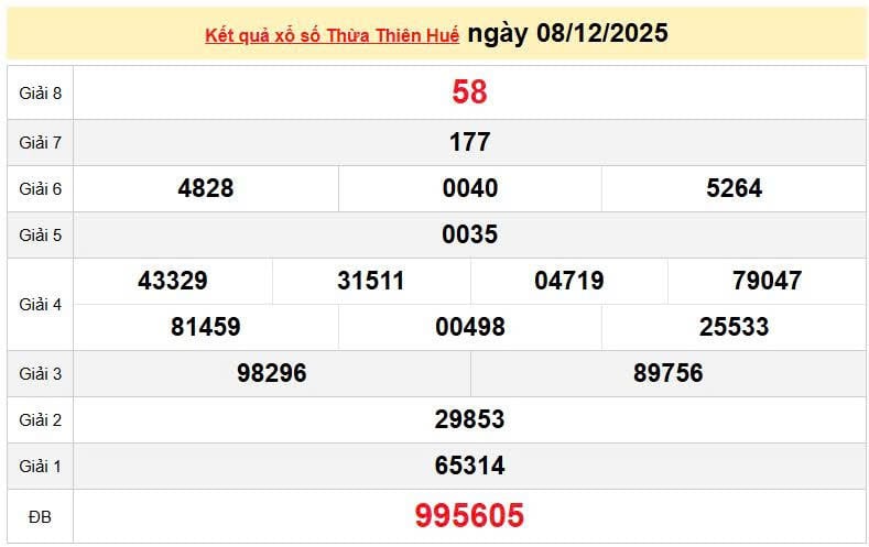 XSTTH 8/12, KQXSTTH 8/12. Xem lại kết quả xổ số Thừa Thiên Huế ngày 8/12/2025
