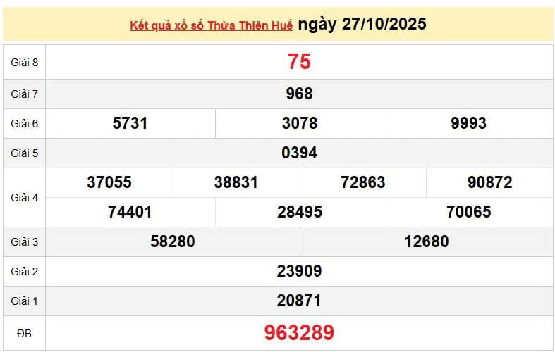 XSTTH 27/10, KQXSTTH 27/10. Xem lại kết quả xổ số Thừa Thiên Huế ngày 27/10/2025