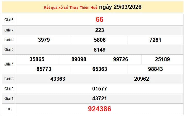 XSTTH 23/3, KQXSTTH 23/3. Xem lại kết quả xổ số Thừa Thiên Huế ngày 23/3/2026