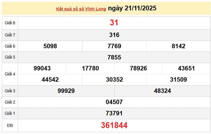 XSVL 21/11, KQXSVL 21/11. Xem lại kết quả xổ số Vĩnh Long ngày 21/11/2025