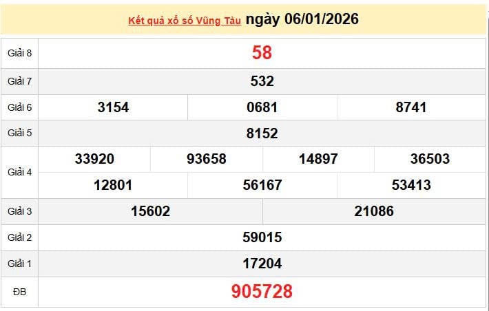 XSVT 6/1, KQXSVT 6/1. Xem lại kết quả xổ số Vũng Tàu ngày 6/1/2026