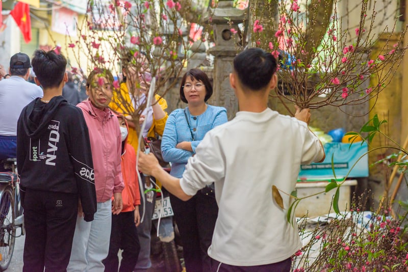 Người dân thích thú khi lựa chọn được cành đào ưng ý. Ảnh: Phong Nguyễn