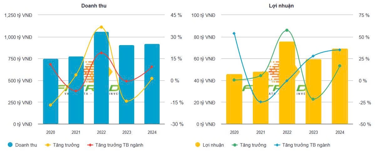 Năm 2024, doanh thu thuần của FT1 đạt khoảng 920 tỷ đồng, tăng nhẹ 1% so với cùng kỳ. Dù tăng trưởng doanh thu không lớn, lợi nhuận sau thuế vẫn tăng gần 17% lên 69,4 tỷ đồng nhờ biên lợi nhuận gộp cải thiện từ 16,9% lên 17,4%, doanh thu tài chính tăng và chi phí quản lý doanh nghiệp giảm. EPS năm nay đạt hơn 9.800 đồng/cổ phiếu.