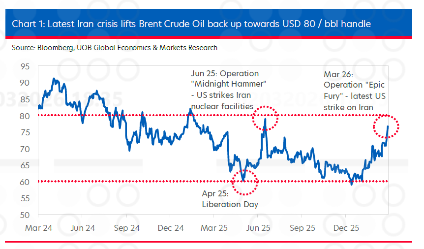 Trong bối cảnh xung đột leo thang tại Iran, UOB lưu ý nhà đầu tư cần theo dõi sát khả năng giá năng lượng tăng cao lan truyền sang lạm phát, làm gia tăng rủi ro lạm phát tại Mỹ. Bởi, giá dầu Brent quanh 80 USD/thùng có nguy cơ khiến lạm phát ngắn hạn khó giảm. Tại cuộc họp FOMC sắp tới, thị trường sẽ đặt câu hỏi về mức độ tác động của giá năng lượng lên triển vọng lạm phát của Mỹ.