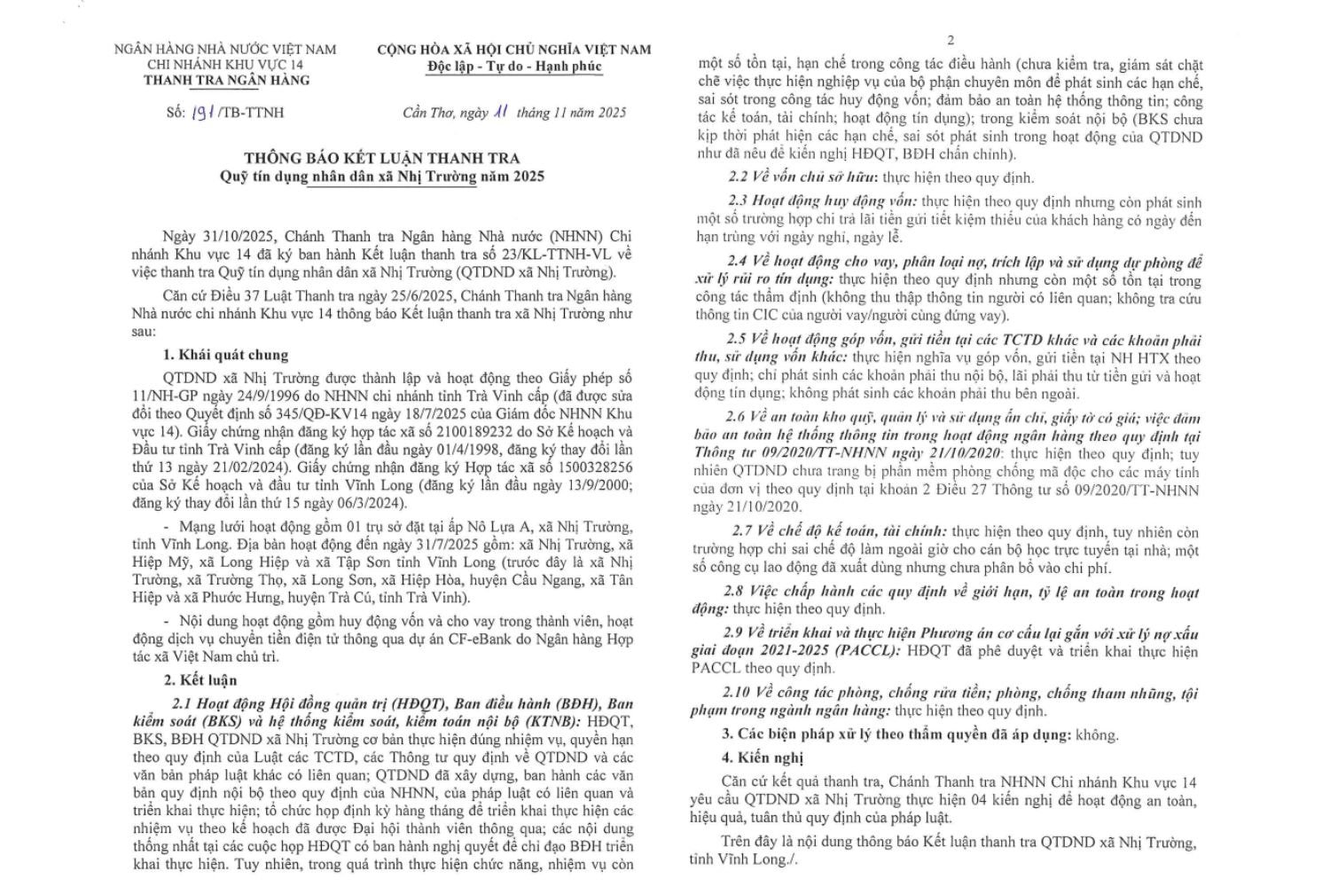 Ngày 31/10/2025, Thanh tra Ngân hàng Nhà nước Chi nhánh Khu vực 14 đã ban hành kết luận thanh tra số 23/KL-TTNH-VL đối với Quỹ tín dụng nhân dân xã Nhị Trường, tỉnh Trà Vinh. Kết quả thanh tra cho thấy Quỹ hoạt động đúng quy định pháp luật, đảm bảo an toàn trong công tác huy động và cho vay vốn, tuy nhiên vẫn còn một số tồn tại, hạn chế cần sớm được khắc phục để nâng cao hiệu quả hoạt động.