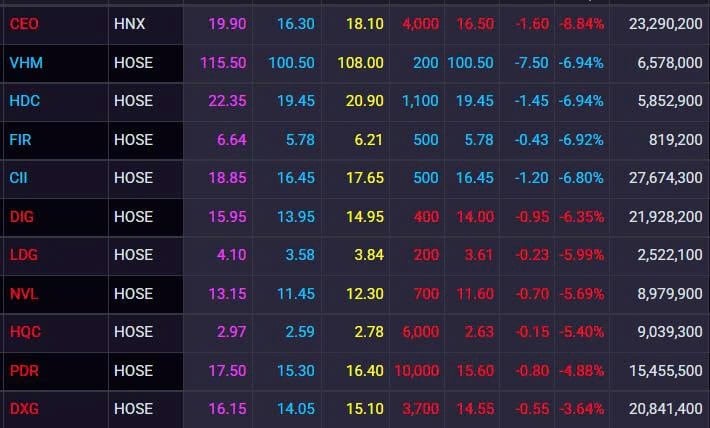 margin: 15px auto;" />Các cổ phiếu vốn hóa lớn mà tiêu biểu là VHM giảm hết biên độ (-6,94%) kéo theo HDC, FIR, DIG cùng đóng cửa tại mức giá sàn. Nhiều mã khác như TAL, NHA, LDG, KHG, HQC, NVL cũng giảm trên 5%.