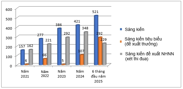 Đặc biệt, trong 6 tháng đầu năm 2025, toàn hệ thống tiếp nhận 525 sáng kiến được đăng ký, tăng 23% so với cùng kỳ năm 2024. Trung bình giai đoạn 2021 - 2025, số sáng kiến tăng trưởng khoảng 22%/năm, phản ánh sự lan tỏa mạnh mẽ của văn hóa đổi mới sáng tạo trong hệ thống.