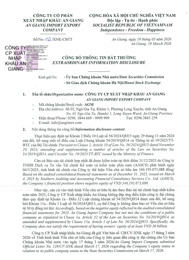 Công ty CP Xuất nhập khẩu An Giang (UPCoM: AGM) vừa công bố thông tin bất thường, xác nhận không duy trì được tư cách công ty đại chúng. Theo báo cáo tài chính hợp nhất được kiểm toán năm 2025 bởi Công ty TNHH Dịch vụ Tư vấn Tài chính Kế toán và Kiểm toán phía Nam (AASCS), vốn chủ sở hữu của doanh nghiệp ghi nhận mức âm 340,2 tỷ đồng tại thời điểm 31/12/2025.