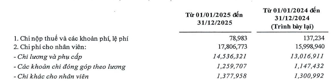 Về quy mô nhân sự, tại thời điểm 31/12/2025, tổng số cán bộ, công nhân viên của BIDV và các công ty con đạt 29.273 người, tăng 275 người so với cuối năm 2024. Như vậy, số lượng lao động chỉ biến động nhẹ, trong khi tổng chi phí dành cho nhân sự tăng nhanh hơn, phản ánh áp lực tiền lương và các khoản phúc lợi trong bối cảnh ngân hàng duy trì tăng trưởng kinh doanh.