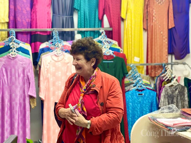 Du khách nước ngoài thích thú lựa chọn áo dài lụa làm đồ lưu niệm. Ảnh: Nhật Chi
