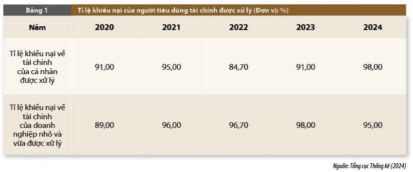 Theo Kết quả của cuộc Điều tra Lao động và việc làm do Tổng cục Thống kê thực hiện trong Quý III/2024 nhằm thu thập thông tin phục vụ đánh giá Chiến lược tài chính toàn diện quốc gia đến năm 2025, định hướng đến năm 20309, tỉ lệ phần trăm khiếu nại của người tiêu dùng tài chính đã được xử lý trong giai đoạn 2020 - 2024 đạt mức cao (từ 89 - 98%) ở cả nhóm cá nhân và doanh nghiệp vừa và nhỏ. Tuy nhiên, tỉ lệ này có sự dao động và không cho thấy xu hướng tăng vững chắc qua từng năm trong giai đoạn nghiên cứu. (Bảng 1)