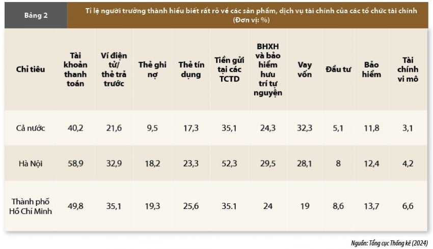 Tuy nhiên, cũng theo Kết quả của cuộc Điều tra Lao động và việc làm nói trên, mức độ hiểu biết của người trưởng thành trong cả nước đối với các sản phẩm, dịch vụ tài chính vẫn còn hạn chế, với mức hiểu biết cao nhất là 40,2% đối với tài khoản thanh toán và mức thấp nhất là 3,1% đối với các sản phẩm tài chính vi mô. Ngay ở hai trung tâm kinh tế lớn nhất cả nước là Hà Nội và Thành phố Hồ Chí Minh, mức độ hiểu biết tài chính của người dân cũng chưa thực sự nổi bật so với mức bình quân của cả nước. (Bảng 2)