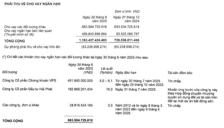 Theo báo cáo bán niên 2025, Vinaconex từng cho Công ty CP Chứng khoán VPS vay tín chấp 451,9 tỷ đồng với lãi suất 5–6,1%/năm; cho Công ty CP Đầu tư Hải Phát vay 182,9 tỷ đồng với lãi suất 16%/năm, tài sản thế chấp là quyền sử dụng đất tại một số dự án bất động sản; ngoài ra còn 28,8 tỷ đồng cho các công ty khác vay tín chấp. Bước sang quý 3, quy mô cho vay mở rộng thêm hàng nghìn tỷ đồng, chủ yếu là cho bên ngoài vay ngắn hạn, được thuyết minh rõ là có tài sản bảo đảm, bảo lãnh ngân hàng.