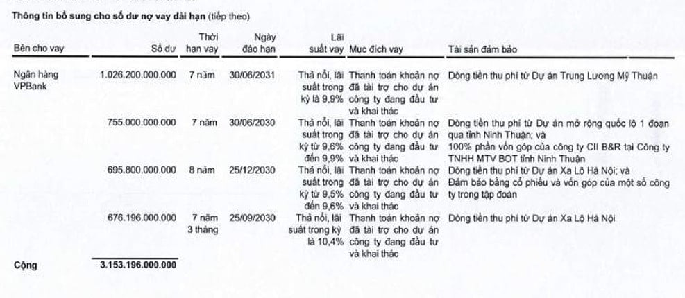 Không chỉ trái phiếu, CII còn tận dụng các khoản vay dài hạn tại ngân hàng thương mại. Doanh nghiệp hiện vay tại Vietcombank tổng cộng hơn 8.379 tỷ đồng; gồm khoản vay hơn 4.700 tỷ đồng đáo hạn 2035 cho dự án Trung Lương – Mỹ Thuận, gần 1.900 tỷ đồng đáo hạn 2035 và 1.694 tỷ đồng đáo hạn 2029 cho dự án Xa lộ Hà Nội. Các khoản vay này đều được thế chấp bằng quyền tài sản từ hợp đồng BOT và dòng tiền thu phí. Tương tự, CII đã dùng tài sản bảo đảm là dòng tiền thu phí từ các BOT để thế chấp cho các khoản vay dài hạn, tổng dư nợ hơn 3.153 tỷ đồng tại VPBank.<#p>