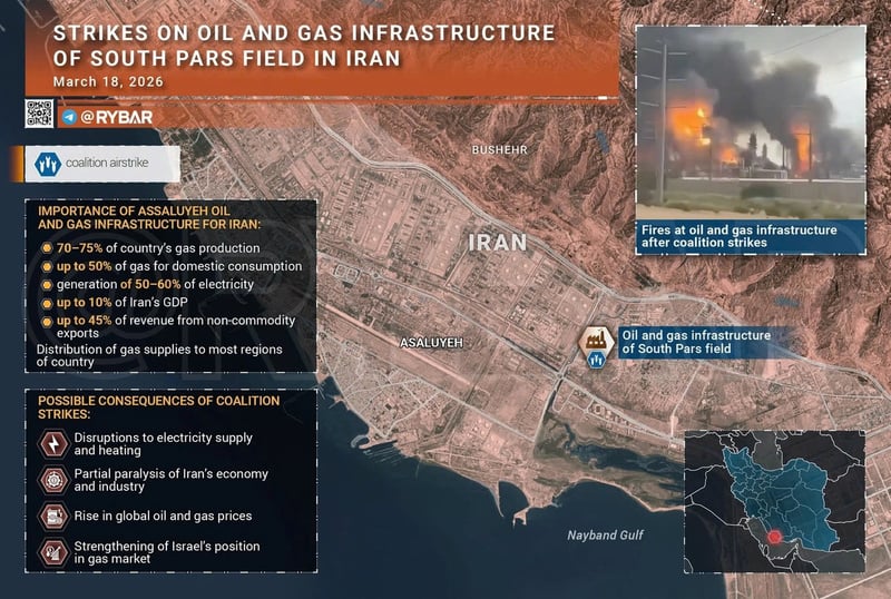 margin: 15px auto;" />Các cơ sở hạ tầng dầu khí gần mỏ Nam Pars của Iran đã bị Israel tấn công. Các trung tâm xử lý và phân phối khí đốt quan trọng, cũng như một số nhà máy lọc dầu, đã bị hư hại. Ảnh: Rybar