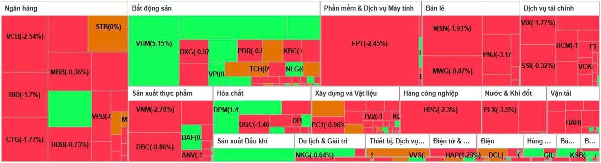 Ở chiều ngược lại, nhiều cổ phiếu vốn hóa lớn chịu áp lực điều chỉnh khá mạnh. PLX là mã giảm sâu nhất trong nhóm bluechip khi mất 3,5%, theo sau là GVR giảm 3,2%, VNM giảm 2,8%. Các cổ phiếu FPT, SAB và VCB cũng đồng loạt giảm quanh mức 2,5%, phản ánh tâm lý thận trọng bao trùm nhóm dẫn dắt.