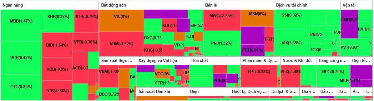 Một số cổ phiếu trụ khác như VCB, HPG, CTG, DGC, MBB hay VRE chỉ nhích nhẹ quanh ngưỡng 1%, phản ánh tâm lý thận trọng của dòng tiền lớn.