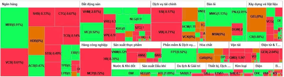 Theo nhóm ngành, ba trụ cột chính là ngân hàng, chứng khoán và thép đều điều chỉnh nhẹ. Trong ngành ngân hàng, ngoài MBB, một số mã như ACB, VIB, EIB, TPB và LPB nhích tăng nhẹ. Ngược lại, các cổ phiếu lớn như CTG, VCB, VPB, STB, TCB và BID đều giảm điểm, tạo sức ép lên chỉ số chung.