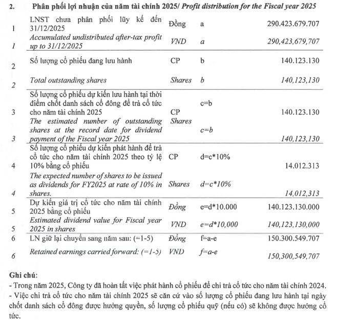 Tuy nhiên, bức tranh tăng trưởng này đi kèm với chính sách cổ tức đáng lưu ý. Sau khi không hoàn thành kế hoạch năm 2025, Hội đồng quản trị tiếp tục đề xuất chia cổ tức bằng cổ phiếu với tỷ lệ 10%, tương ứng phát hành hơn 14 triệu cổ phiếu mới. Nếu được thông qua, vốn điều lệ của doanh nghiệp sẽ tăng lên trên 1.541 tỷ đồng, đồng thời phần lợi nhuận giữ lại chuyển sang năm sau còn khoảng 150,3 tỷ đồng.