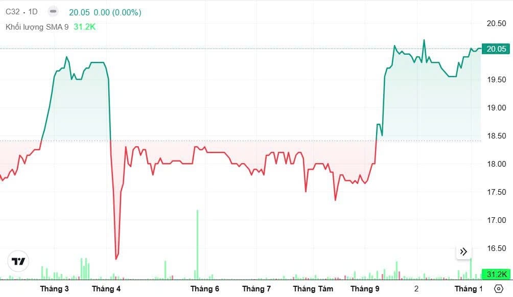 Trên thị trường chứng khoán, cổ phiếu C32 đang duy trì đà tăng tích cực, với mức tăng khoảng 15% trong gần ba tháng qua, từ vùng 17.000 đồng lên trên 20.000 đồng/cổ phiếu, tiến gần đỉnh ba năm. Thanh khoản bình quân đạt hơn 15.000 cổ phiếu mỗi phiên. Mã này từng lập đỉnh lịch sử trên 34.000 đồng vào đầu năm 2022.