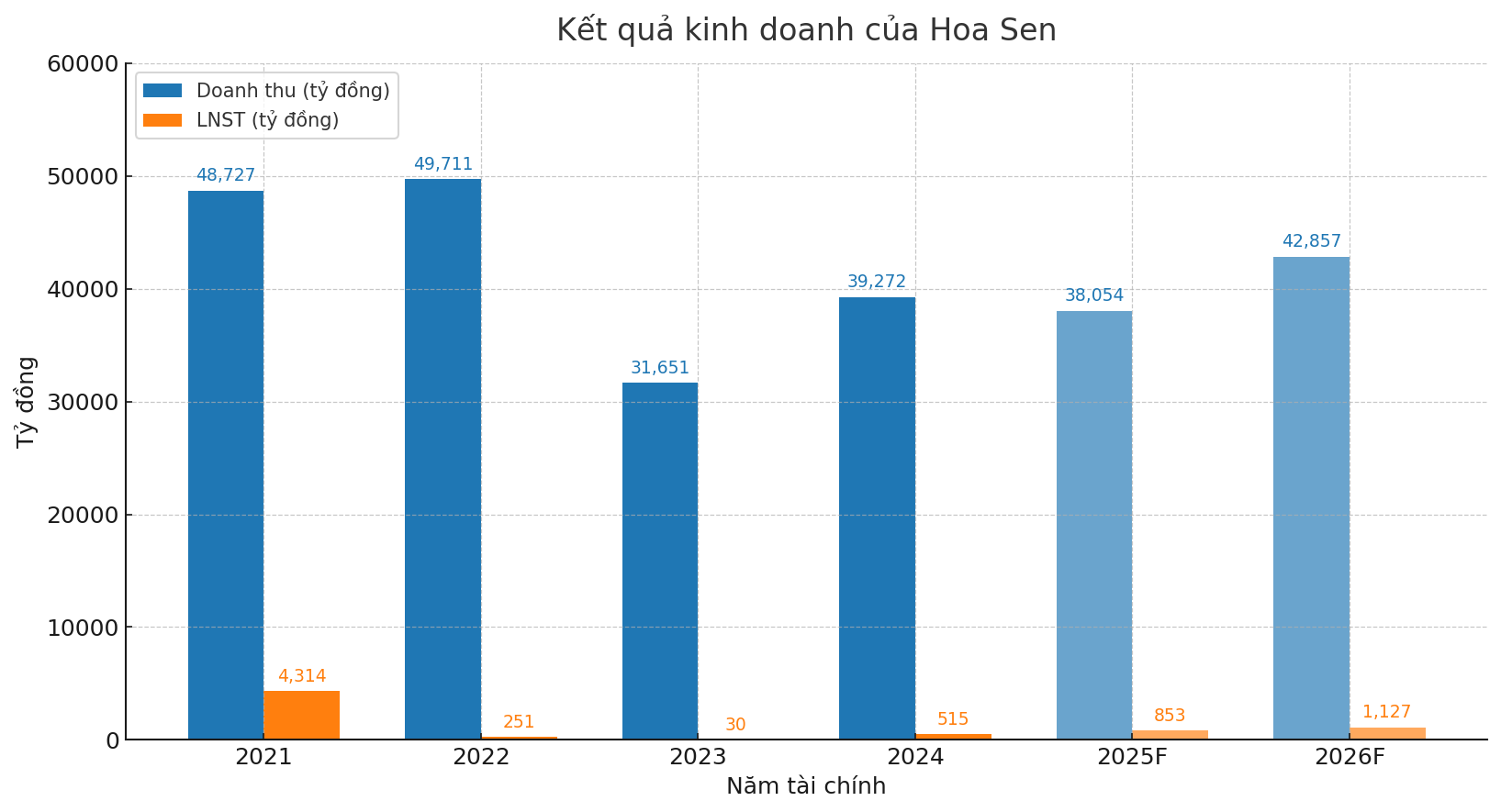 Về tình hình kinh doanh các năm gần đây, trong năm tài chính 2021, khi giá thép lên cao, Hoa Sen ghi nhận đạt 48.727 tỷ đồng doanh thu và 4.314 tỷ đồng lợi nhuận sau thuế, con số kỷ lục trong lịch sử, tuy nhiên các năm sau đó, doanh thu lần lượt ở mức 49.711 tỷ và 31.651 tỷ đồng trong năm 2022 và 2023, song lợi nhuận lại thu hẹp mạnh về 251 tỷ rồi 30 tỷ đồng. Đến năm 2024, Hoa Sen cho thấy khả năng xoay chuyển đáng nể khi doanh thu phục hồi lên khoảng 39.272 tỷ đồng, lợi nhuận đạt 515 tỷ đồng, dù giá nguyên liệu vẫn nhiều biến động.<#p>