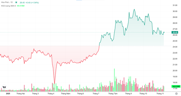 Mặc dù giá cổ phiếu đã điều chỉnh gần 15% trong ngắn hạn, nhưng về dài hạn, Hòa Phát vẫn được xem là một trong những trụ cột của nền kinh tế vật liệu Việt Nam, nơi câu chuyện tăng trưởng không chỉ nằm ở con số lợi nhuận, mà còn ở sức bền và quy mô tích lũy qua từng chu kỳ.