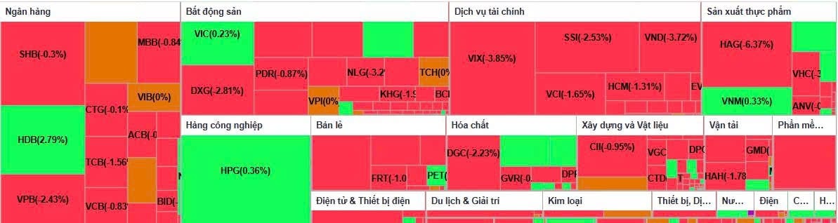 Điểm sáng hiếm hoi là cổ phiếu HDB. Mã này trở thành tâm điểm hút dòng tiền với gần 21 triệu cổ phiếu được khớp lệnh – mức cao vượt trội toàn ngành ngân hàng. Kết phiên, HDB bật tăng 2,79% lên 31.300 đồng/cổ phiếu, trở thành cổ phiếu tác động tích cực nhất lên VN-Index trong phiên.