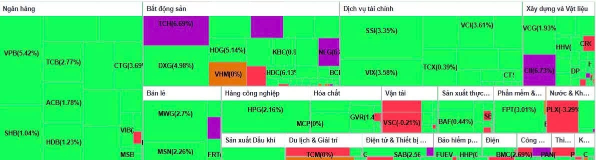 Nhiều mã lớn khác cũng đồng loạt lấy lại sắc xanh. FPT tăng trên 3%, còn HPG, MSN, MBB, VIB, STB, VIC, MWG và CTB tăng từ 2% đến gần 3%, qua đó góp phần giữ nhịp đi lên cho chỉ số. Ở chiều ngược lại, áp lực điều chỉnh không lớn. PLX là mã giảm đáng kể nhất khi lùi hơn 3% xuống 39.650 đồng/cổ phiếu. Một số mã khác như VRE, SSB và VJC chỉ giảm nhẹ.