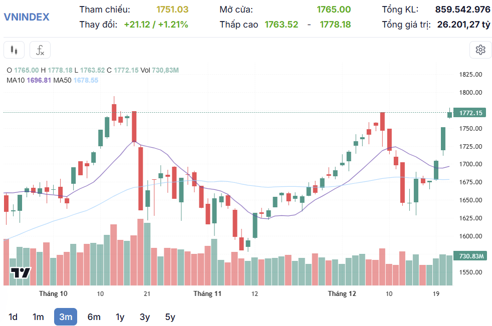(Banker.vn) Phiên hôm nay (ngày 23/12), VN-Index vượt mốc 1.770 điểm nhờ sức bật từ nhóm Vingroup với VIC với VHM tăng trần, bên cạnh đó là đà tăng của STB trước thông tin bổ nhiệm nhân sự cấp cao.