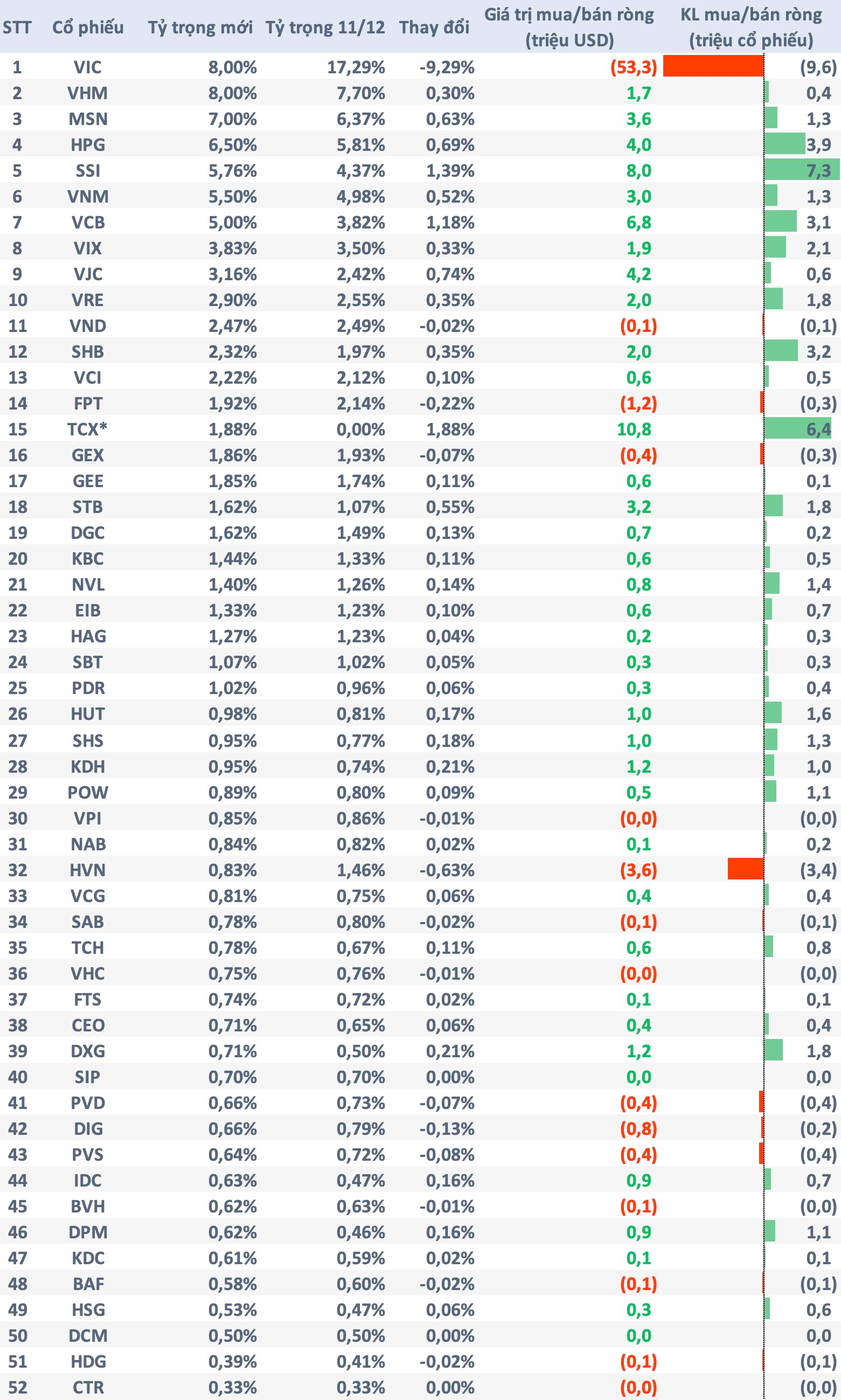Ở chiều ngược lại, VIC là cái tên chịu áp lực bán mạnh nhất trong kỳ cơ cấu, với lượng bán dự kiến lên đến 53 triệu USD, tương đương khoảng 9,6 triệu cổ phiếu. HVN cũng nằm trong nhóm bị giảm tỷ trọng đáng kể, khoảng 3,4 triệu đơn vị. Một số mã khác bị bán ra nhưng với khối lượng không lớn.