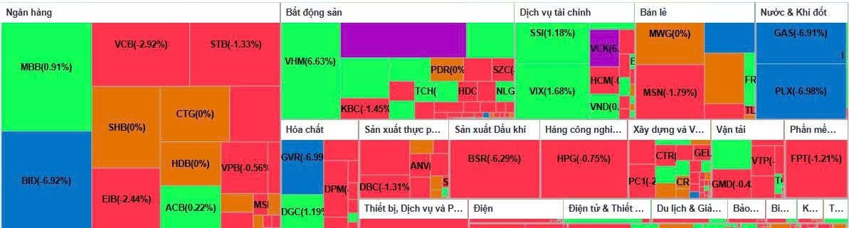 Tuy nhiên, phần lớn các cổ phiếu vốn hóa lớn lại chịu áp lực bán mạnh. Bốn mã GVR, BID, PLX và GAS đều giảm hết biên độ và đóng cửa ở mức giá sàn với thanh khoản cao, khớp từ hơn 6 triệu đến gần 23 triệu cổ phiếu. Một số cổ phiếu khác như SAB và VCB giảm hơn 2%, trong khi VJC, FPT, STB, VNM và MSN lùi từ hơn 1% đến gần 2%, tạo lực cản đáng kể lên chỉ số chung.