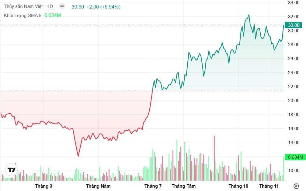 Kết phiên, cổ phiếu đầu ngành thủy sàn này tăng trần lên 30.800 đồng/cp, với hơn 6,6 triệu đơn vị được khớp lệnh – mức thanh khoản cao hơn nhiều so với trung bình giai đoạn trước. Tính từ vùng đáy khoảng 7 tháng trước, ANV đã tăng giá tới 2,5 lần, đánh dấu một trong những nhịp phục hồi mạnh nhất nhóm thủy sản.
