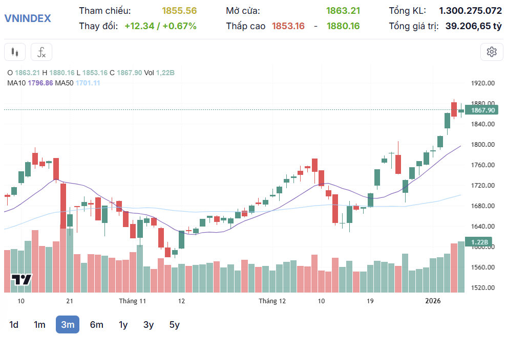 margin: 15px auto;" />Phiên giao dịch cuối tuần ngày 9/1 mở cửa trong sắc xanh hy vọng. Sau khi chạm đỉnh 1.872 điểm, thị trường bắt đầu rung lắc dữ dội khi áp lực chốt lời ngắn hạn dâng cao, kéo chỉ số lùi về vùng 1.865. Độ rộng thị trường nghiêng hẳn về phe bán với 191 mã đỏ, cho thấy tâm lý thận trọng bao trùm diện rộng. Tuy nhiên, thị trường không hề đơn độc khi nhóm ngân hàng (BID, VCB, CTG) và họ Viettel (VTP, CTR) đã có màn "trình diễn" cực kỳ thuyết phục để giữ nhịp chỉ số.
