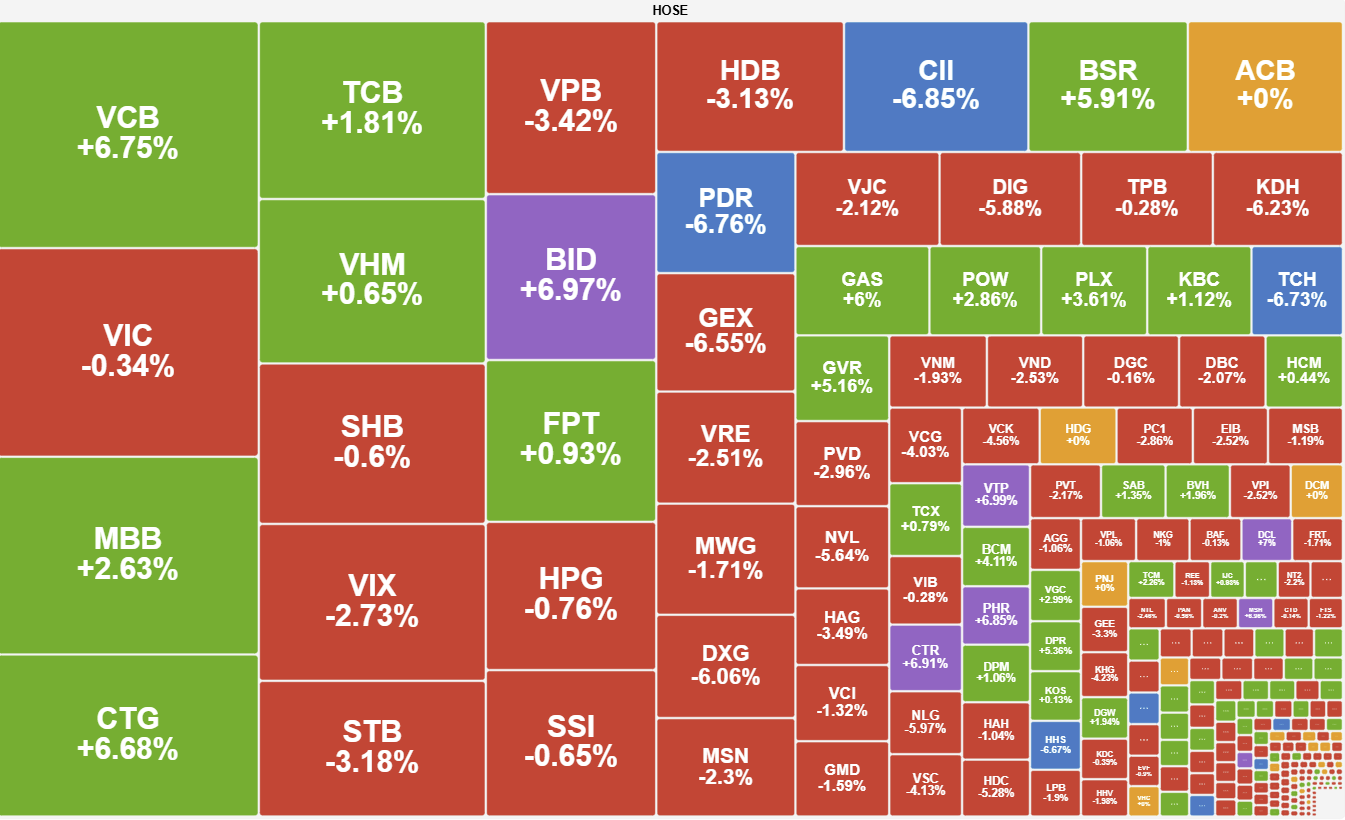 Kết thúc phiên giao dịch, sàn HOSE có 107 mã tăng và 219 mã giảm, VN-Index tăng 12,34 điểm (+0,67%), lên 1.867,9 điểm. Tổng khối lượng giao dịch đạt hơn 1,3 tỷ đơn vị, giá trị đạt 39.206,7 tỷ đồng, tăng hơn 8% về khối lượng nhưng giảm nhẹ 2% về giá trị so với phiên hôm qua. Giao dịch thỏa thuận đóng góp hơn 82,2 triệu đơn vị, giá trị đạt 3.168 tỷ đồng.