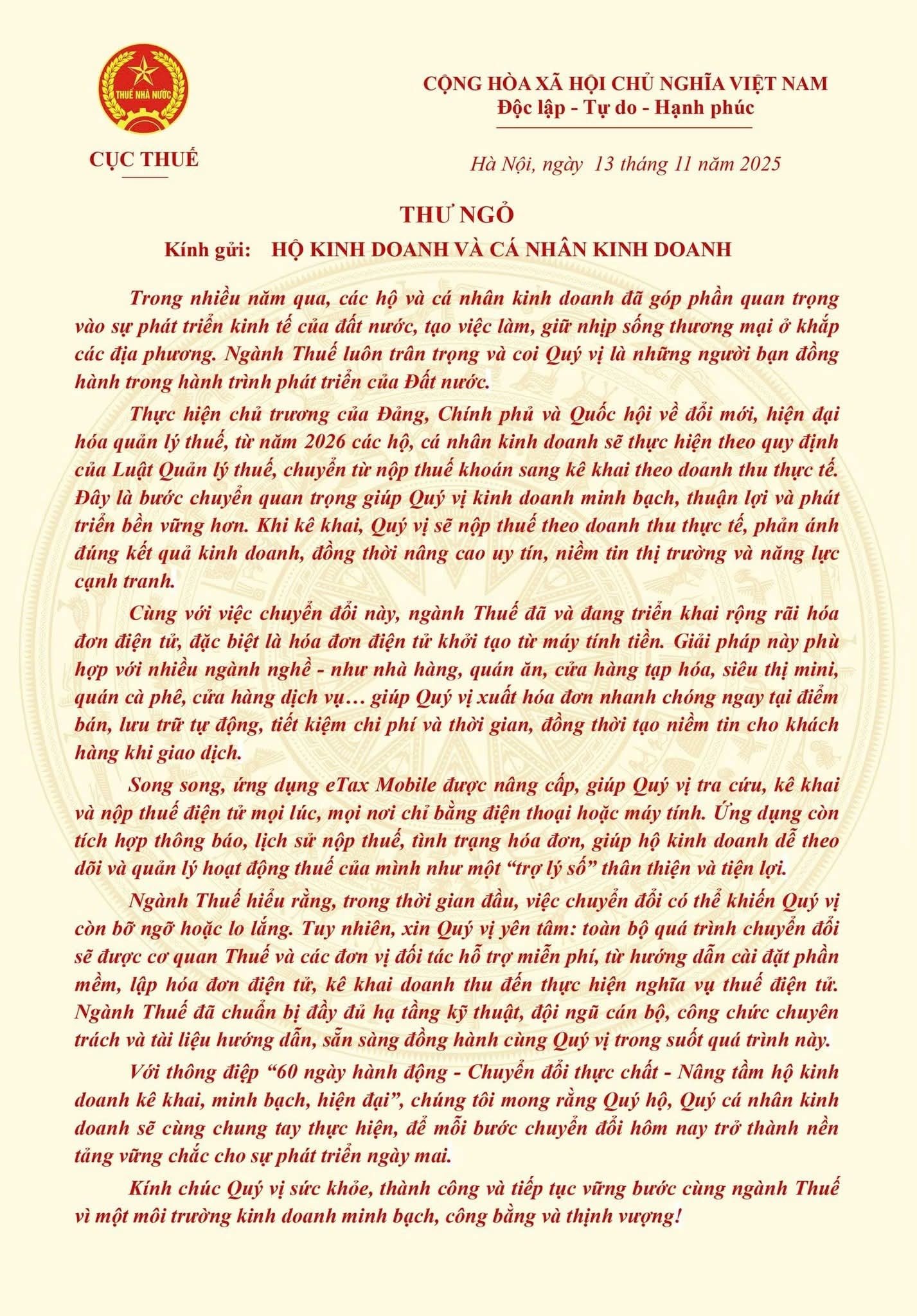Cục Thuế gửi thư ngỏ, khẳng định hỗ trợ tối đa việc chuyển đổi khỏi thuế khoán<#h1>Bài cùng chuyên mục