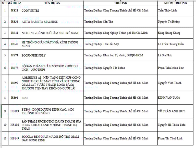 Top 11 dự án xuất sắc - Bảng sinh viên lọt vào vòng chung kết cuộc thi.