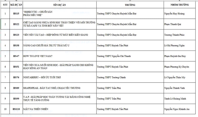 Top 10 dự án xuất sắc - Bảng học sinh lọt vào vòng chung kết cuộc thi