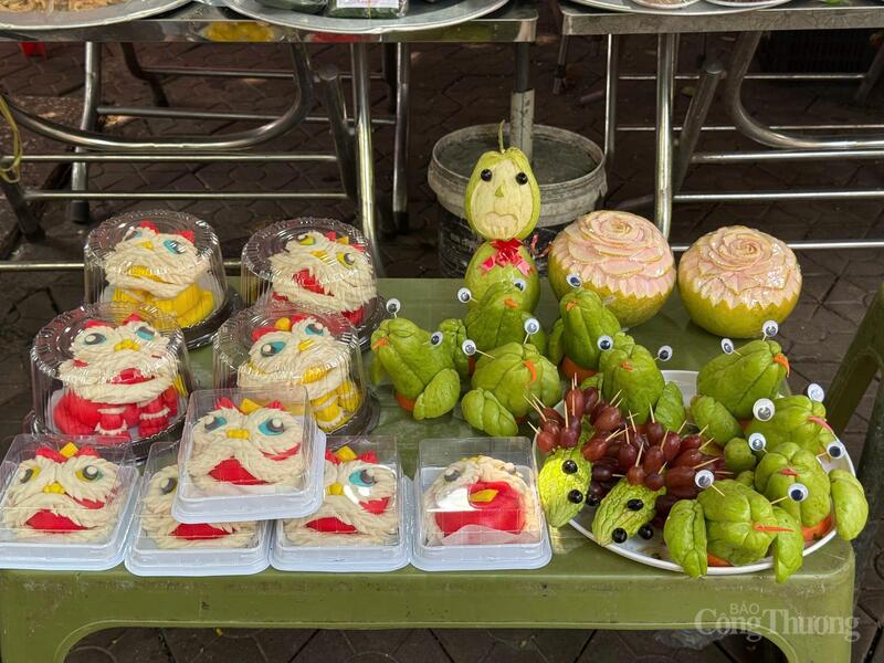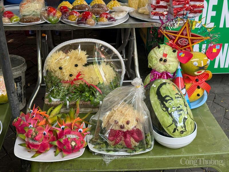 Tại chợ Hôm (Hà Nội), các quầy hàng hoa quả nghệ thuật bày kín lối đi. Trái cây được tỉa thành hình thỏ ngọc, cá chép, mặt trăng, hoặc kết thành giỏ mang chủ đề “Đêm trăng đoàn viên”. Theo anh Phạm Văn Hưng, chủ cửa hàng hoa quả Hưng Lộc, khách đặt hàng sớm từ đầu tháng Tám âm lịch. “Năm nay mẫu được yêu thích nhất là giỏ trái cây hình trăng rằm và đôi thỏ ngọc. Một giỏ nhỏ có giá 300.000 - 400.000 đồng, còn loại cao cấp dùng trái cây nhập khẩu có thể lên đến 1 - 1,5 triệu đồng”, anh Hưng cho biết.
