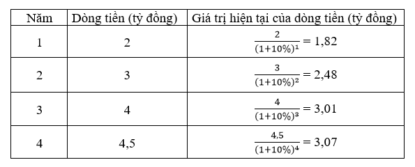 Một dự án đầu tư cần bỏ ra vốn ban đầu là 10 tỷ đồng. Lãi suất chiết khấu là 10%. Dòng tiền ròng dự kiến trong 4 năm tới như sau