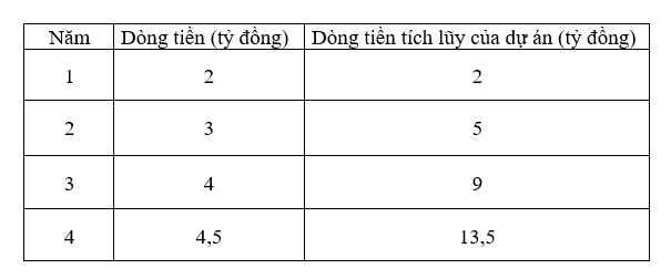 Quay trở lại với ví dụ ban đầu, có thể thấy sau 3 năm dự án mới thu hồi được 9 tỷ đồng, vẫn còn thiếu 1 tỷ đồng so với vốn đầu tư ban đầu. Phần vốn còn thiếu này được bù đắp trong năm thứ 4, khi dự án tạo ra 4,5 tỷ đồng dòng tiền.