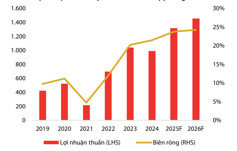 Nhờ kết hợp được tăng trưởng sản lượng với lợi thế chi phí, BMP đang nằm trong nhóm doanh nghiệp có hiệu quả sinh lời nổi bật của ngành nhựa xây dựng. Biên lợi nhuận ròng của doanh nghiệp hiện đã vượt 20%, cao hơn đáng kể so với mức trung bình ngành. Trên nền tảng đó, tỷ suất sinh lời trên vốn chủ sở hữu (ROE) theo các kịch bản dự phóng có thể tiến tới vùng trên 45% trong vài năm tới, mức hiếm gặp trong nhóm doanh nghiệp vật liệu xây dựng.