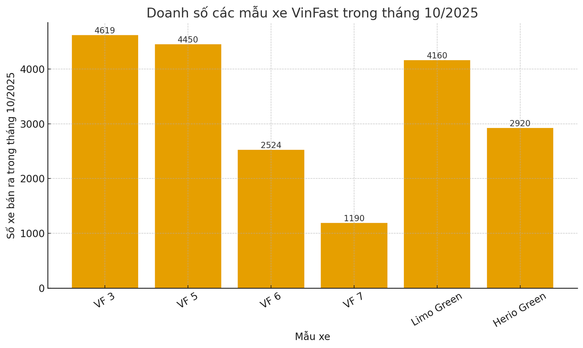 Trong nhóm xe du lịch, VF 3 tiếp tục giữ ngôi đầu khi có 4.619 xe được bàn giao trong tháng 10. Lũy kế 10 tháng năm 2025, mẫu xe điện đô thị cỡ nhỏ này đã đạt 36.005 chiếc, khẳng định sức hút của dòng xe điện giá tốt, phù hợp với nhu cầu di chuyển hàng ngày của phần lớn người dùng Việt.