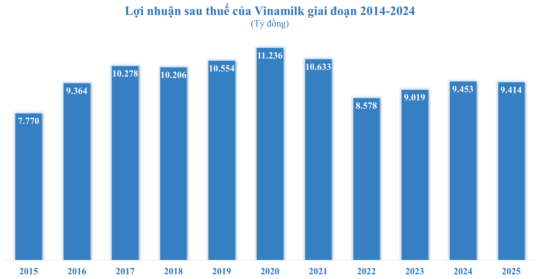 Lũy kế năm 2025, lợi nhuận trước thuế hợp nhất của Vinamilk đạt 11.650 tỷ đồng, tăng trưởng nhẹ so với cùng kỳ. Lợi nhuận sau thuế hợp nhất năm 2025 đạt 9.414 tỷ đồng, giảm nhẹ so với năm 2024 do tác động từ quý I, tuy nhiên mức giảm này đã được thu hẹp đáng kể nhờ kết quả tích cực của các quý tiếp theo. Thu nhập mỗi cổ phần (EPS) năm 2025 đạt 4.028 đồng.