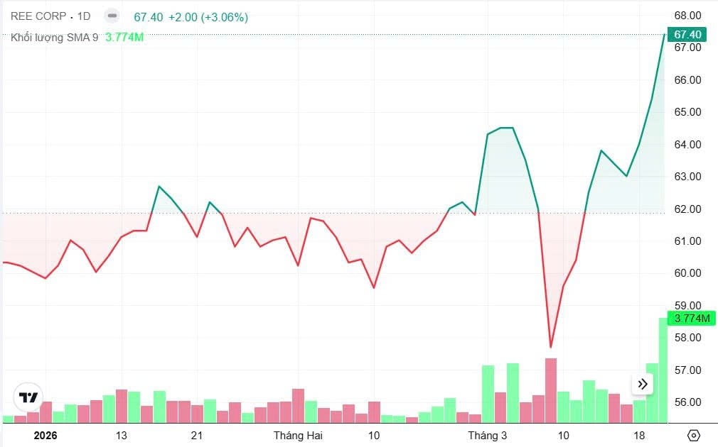 Đáng chú ý, trong phiên có thời điểm mã này được kéo lên mức giá trần 69.900 đồng/cổ phiếu. Cùng với đà tăng của thị giá, thanh khoản REE cũng bùng nổ mạnh khi gần 3,8 triệu cổ phiếu được sang tay, mức cao nhất từ trước đến nay. Vốn hóa thị trường theo đó vượt mốc 36.500 tỷ đồng.