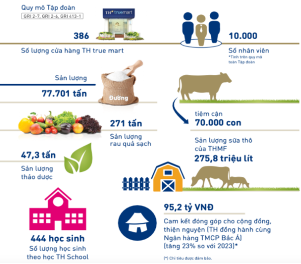 Trong sản xuất, về quy mô, tổng đàn bò của TH tiệm cận mức 70,000 con, sản xuất 275,8 triệu lít sữa, cho ra 47,3 tấn thảo dược, 271 tấn rau quả sạch và 77.701 tấn đường.